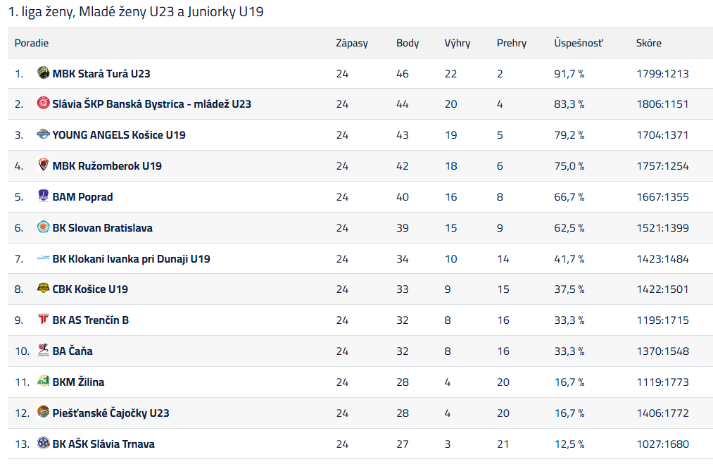 Tím U23 cez víkend 11.-12.4.2026 odohral záverečné 2 zápasy v základnej časti spojenej súťaže 1. ligy žien + U23 + U19. Na potvrdenie víťazstva v tejto súťaži potrebovali naše dievčatá ešte jedno víťazstvo z posledných 2 zápasov. Najprv náš tím nastúpil v sobotu poobede proti súperovi z Trenčína. Trenčiansky klub sa pripravuje na baráž o udržanie v extralige žien, ktorú odohrá proti BAM Poprad, 5. celku 1. ligy žien, nakoľko prvé 4 tímy nemôžu postúpiť do extraligy, keďže tam už pôsobia ich tímy / v našom prípade tím Piešťanských Čajok/. Trenčín tak tento zápas mohol využiť na prípravu na dôležité stretnutia a nastúpil s väčšinou svojho extraligového kádra. Na 12 člennej súpiske tímu trénerov O. Haviara a M. Kubala neboli tentoraz zaradené E. Szmereková, T. Vandlíková, L. Paulechová, A. Vidová, S. Sadloňová a dlhodobo zranené Z. Vaculčiaková a T. Buchová. Naše dievčatá mali dobrý vstup do zápasu, Trenčín však rýchlo vyrovnal na 10 : 10 a po TH B. Vaigl išiel do vedenia 10 : 13. Táto pivotka so 14 bodmi a 11 doskokmi spoločne s japonskou rozohrávačkou S. Yamazaki ako jediné predstavovali nebezpečenstvo pre náš kôš. B. Vaigl sa však rýchlo dostala do problémov s faulami. Do konca štvrtiny sme dokázali otočiť na 18 : 13 a výrazne zlepšenou obranou sme sa po šnúre 15 : 0 vzdialili súperovi na 25 : 13. Následne sme však zvoľnili a súper znížil náš náskok na 6 bodov. Po záverečnej trojke P. Nemečkovej sme v polčase viedli 31 : 22. V zápase sme predvádzali prevažne dôraznú aktívnu obranu a dominovali sme postupne na doskoku s 21 útočnými doskokmi. Vyhýbali sme sa zbytočným stratám a tlak súpera na našu rozohrávku bol naozaj najviac len mierny. Nešla nám len trojková streľba, keď sme dokázali premeniť len 4 z 28 striel. Do druhého polčasu sme vstúpili energicky a súper nekládol zvlášť tuhý odpor. Za 8 minút nedokázal ani raz skórovať, za celú štvrtinu dal len 2 body, a po šnúre 21 : 0 náš tím viedol už o 30 bodov a o výsledku zápasu bolo rozhodnuté. Do záverečnej štvrtiny sa išlo za stavu 54 : 24. tréneri dali priestor celej lavičke a súper dokázal náš náskok trochu zredukovať. Zápas sme jednoznačne vyhrali 72 : 47, Trenčín cestoval domov s nepeknou porážkou po prepadáku v 3. štvrtine a musí tuho premýšľať, ako zachrániť extraligu aj pre budúcu sezónu. Fotogaléria zo zápasu tu. Štatistiky zo zápasu tu.