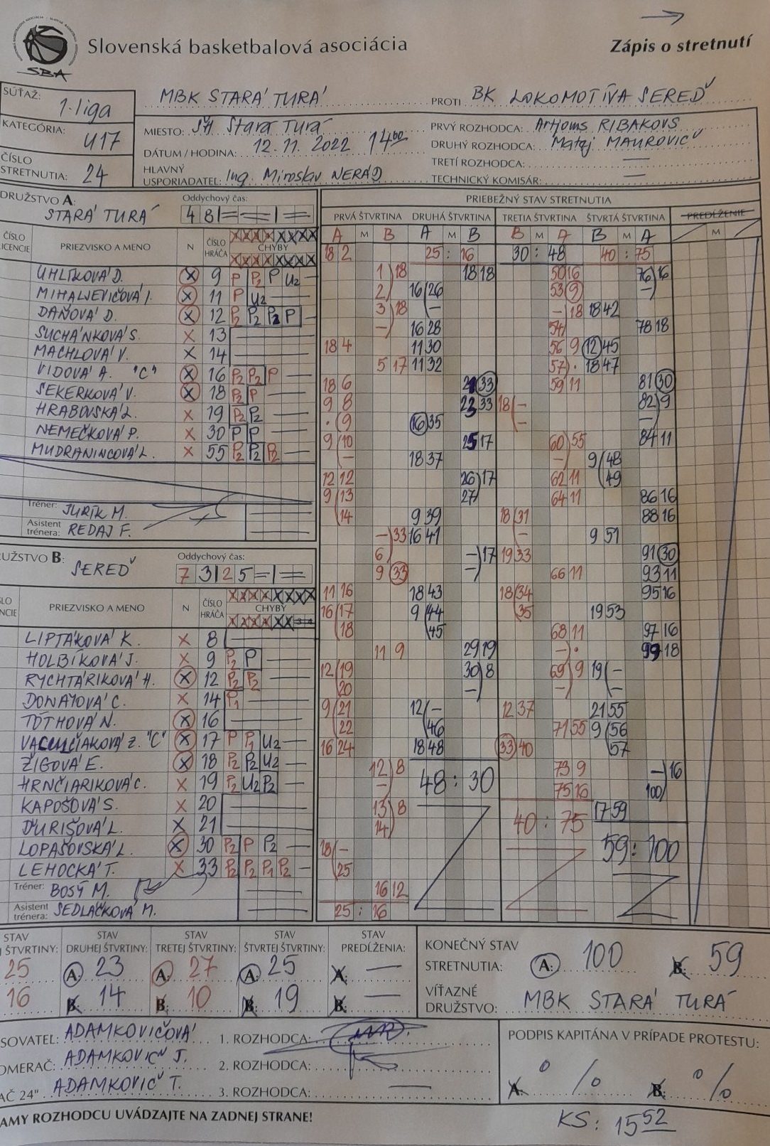 | MBK Stará Turá U2006 | 25 | 23 | 27 | 25 | 100 |